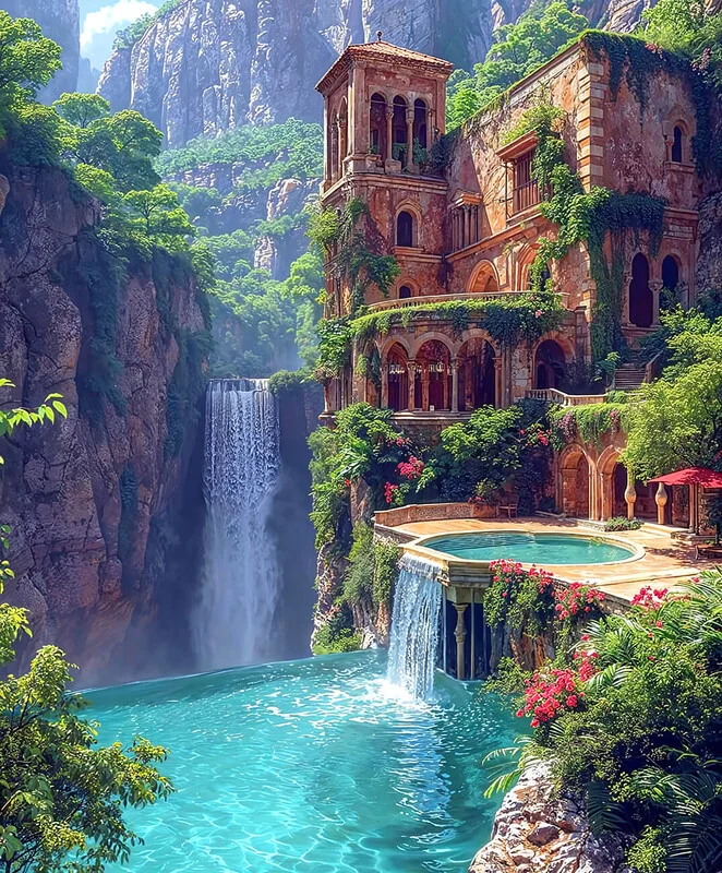 Poster Waterfalls in an Imaginary City, the Mythical Civilization o