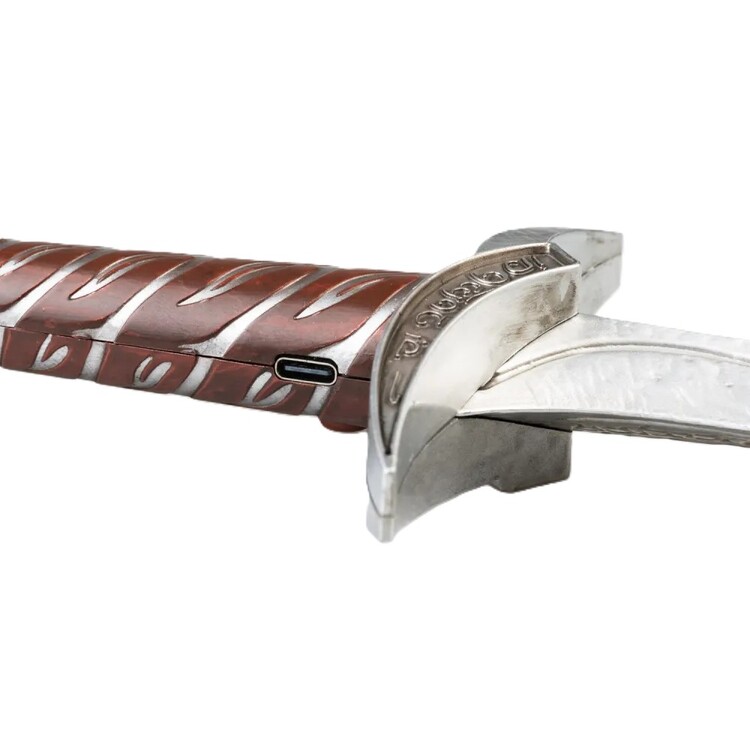 Lampada da parete a forma di Pungolo de Il Signore degli Anelli, con luce blu attivata da un pulsante sull’elsa. ABS resistente, fino a 4 ore con batteria Li-ion integrata da 800 mAh; ricarica tramite cavo USB-C removibile 5 V/1 A (carica completa fino a 3 h 30). Staffa da parete, tasselli e viti inclusi. Pugnale 51 × 12,5 × 3,3 cm; staffa 24,5 × 18,5 × 4,6 cm.