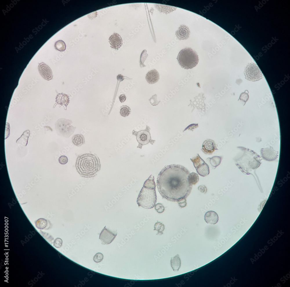 Foto Microscopic diatoms with intricate silica shells, displaying delicate geometric
