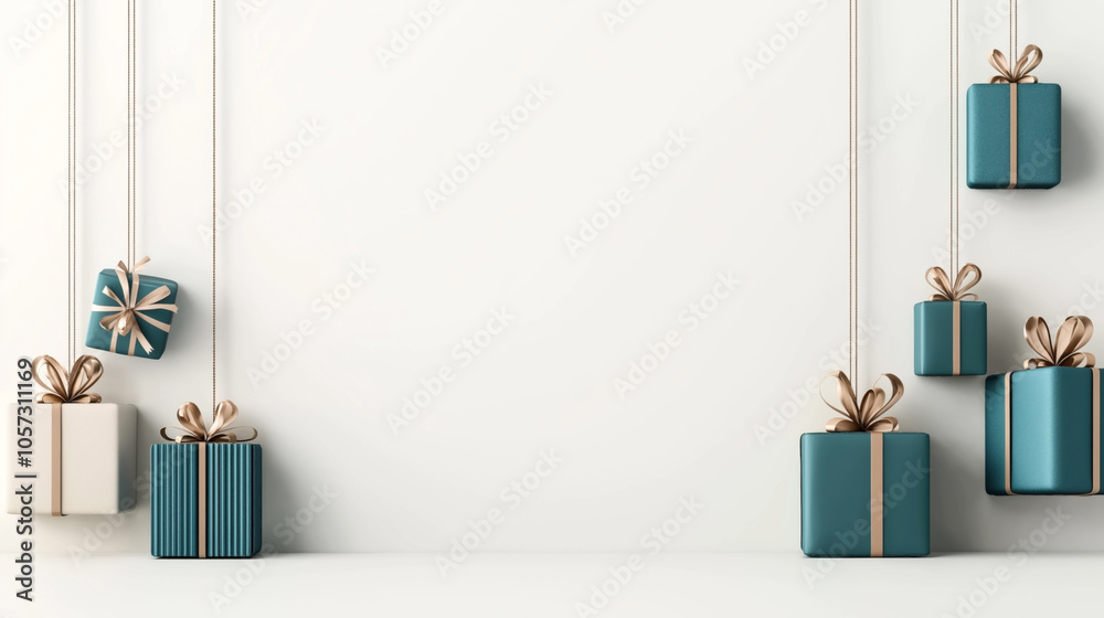 Foto Minimalistic display of suspended gift boxes with blue and white wrapping and gold ribbons on a neutral background