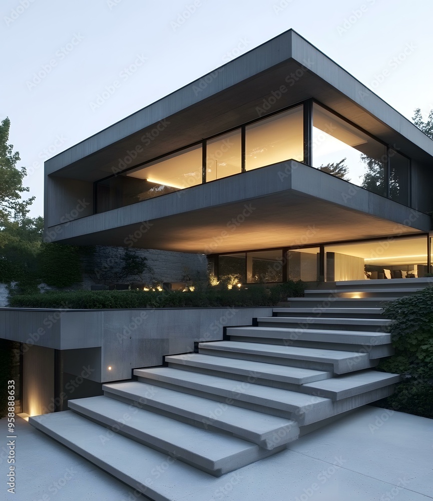 Foto Modern Concrete House with Large Windows and Stone Stairs