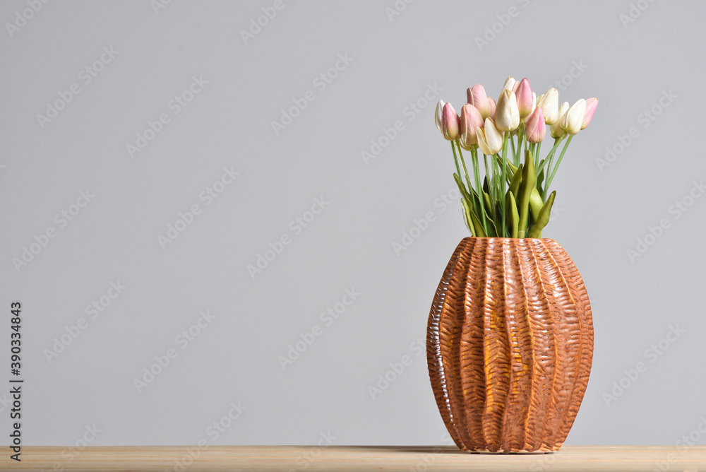 Foto Modern embossed ceramic vase with tulips on a gray background with a copy space