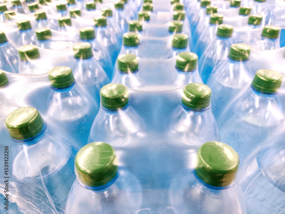 Foto Multiple plastic water bottles tightly packed in shrink wrap, seen from above