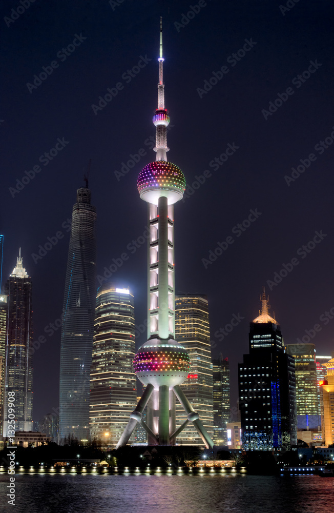 Foto Night Shanghai skyline with Oriental Pearl Tower in the front and reflections in Huangpu river
