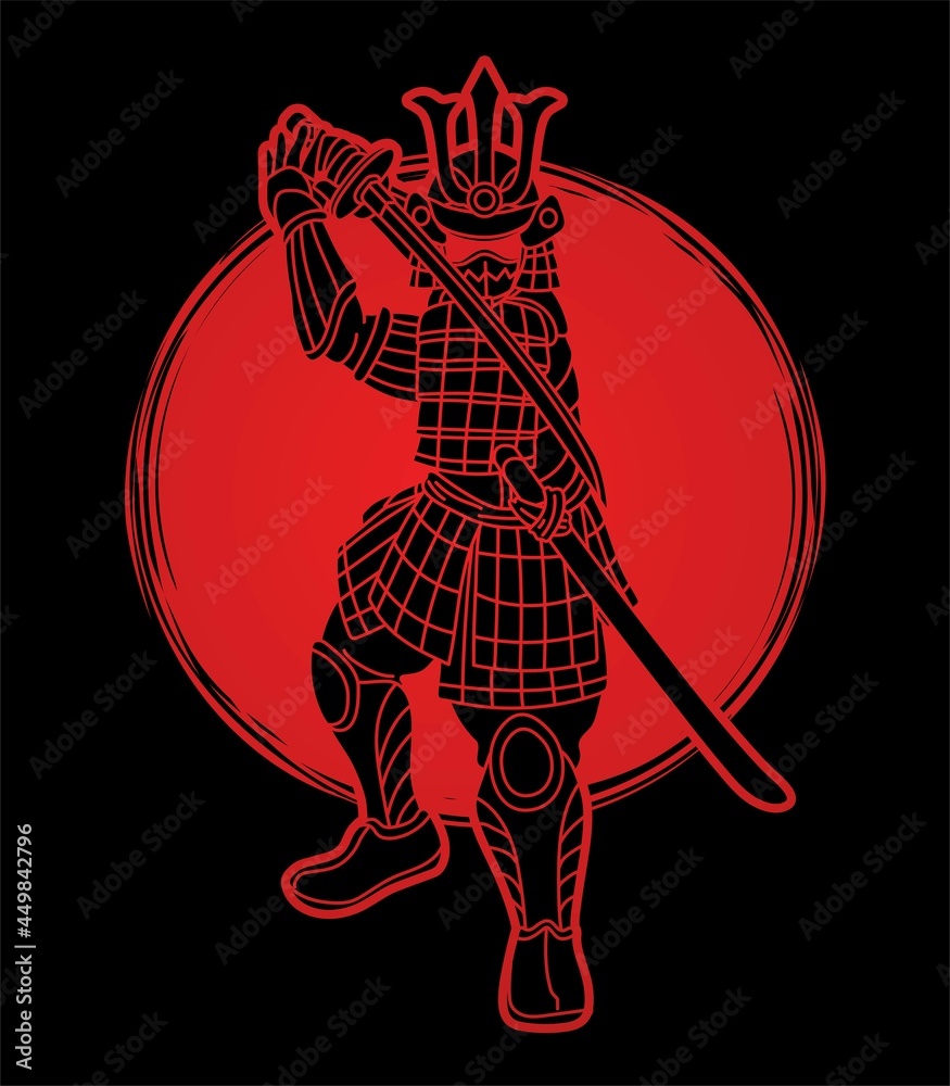 Quadro su tela Samurai Warrior with Weapon Bushido Action Ready to Fight Cartoon Graphic Vector