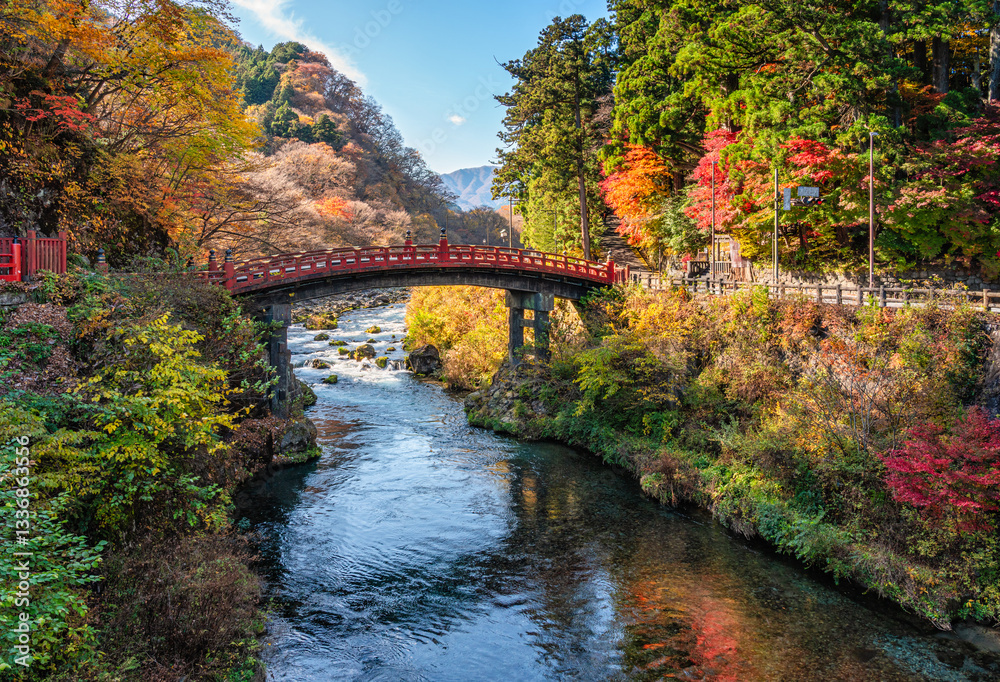 Foto Scenographic sight with the famous Shinkyo Bridge in Nikko during fall season