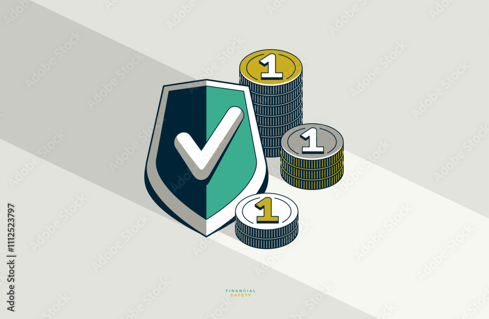 Foto Shield with coins stack vector conceptual poster, financial safety concept, simple icon style illustration of a armor emblem with money, financial protection metaphor