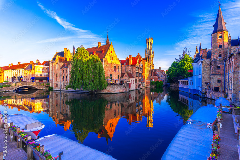 Foto Bruges, Belgium: Sunset view of the Dijver river canal and Belfortower Belfry fr