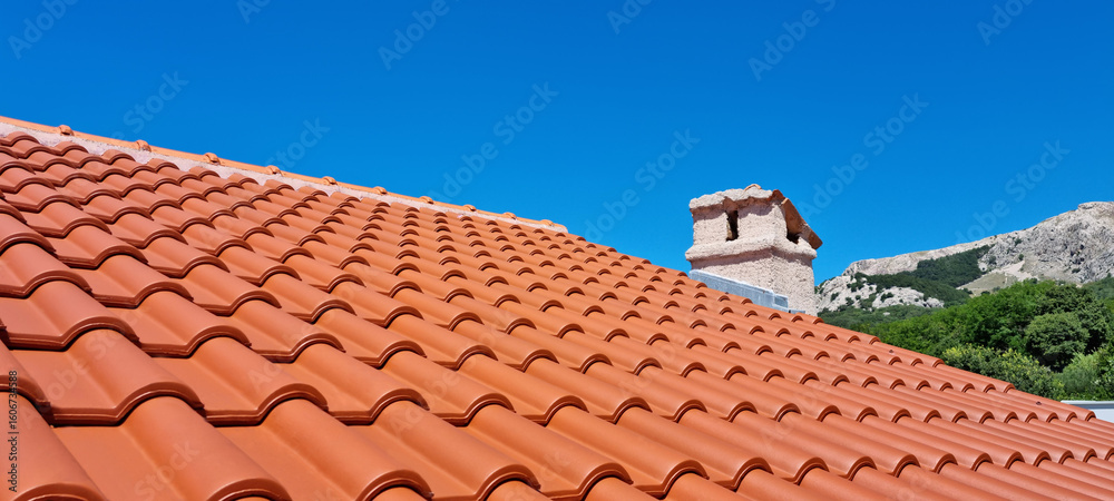 Foto A terracotta tiled roof with a stone chimney under a clear blue sky, with a moun