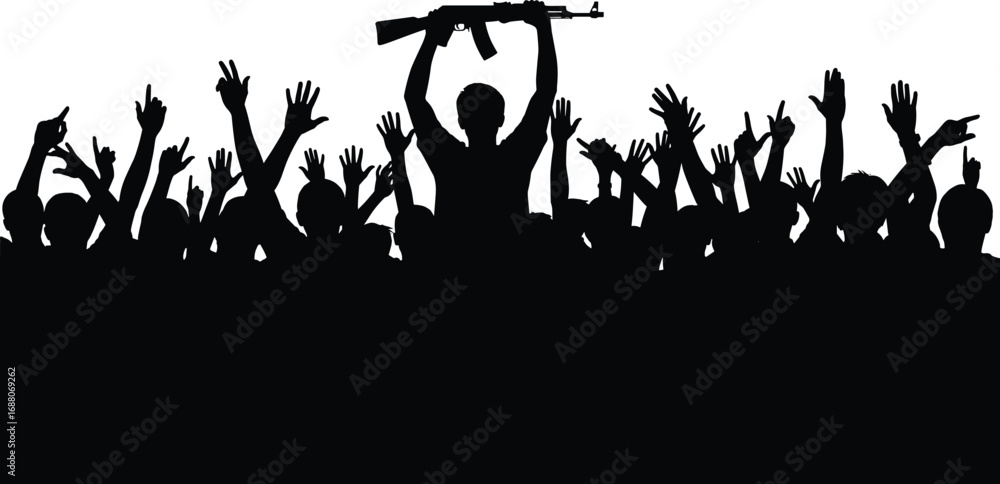 Foto Silhouette vector illustration of crowd protest with raised hands and central fi