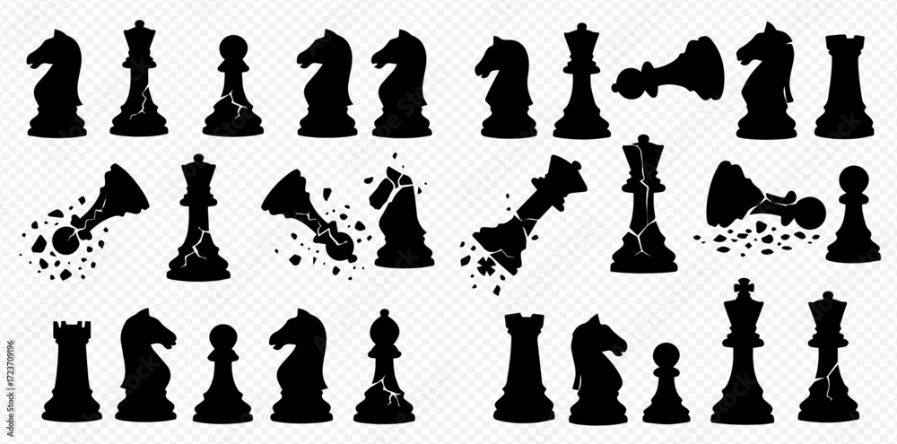 Foto Black silhouette chess pieces arranged in rows, some pieces broken with shattered effect, on a transparent background