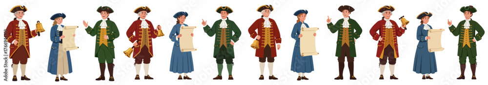 Foto Historical vector character set of 18th-century town criers and colonial figures in traditional costumes holding bells and proclaiming news