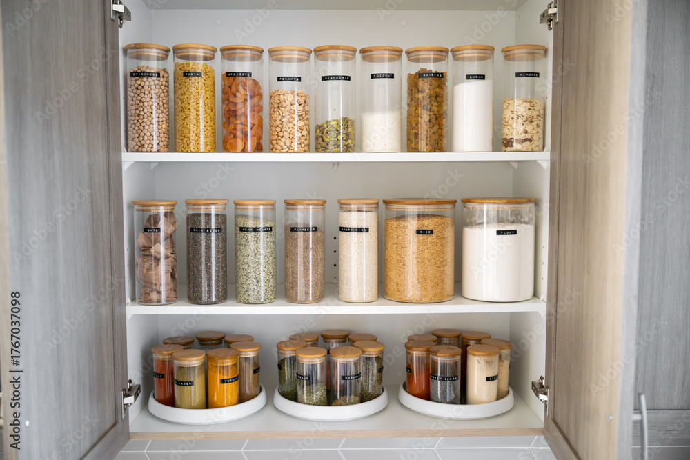 Foto Neatly organized labeled food pantry in a home kitchen with spices grains flour