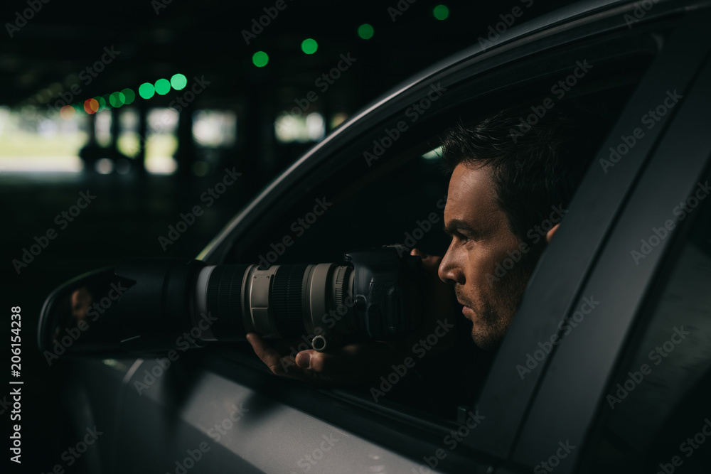 Foto side view of male paparazzi doing surveillance with camera from his car