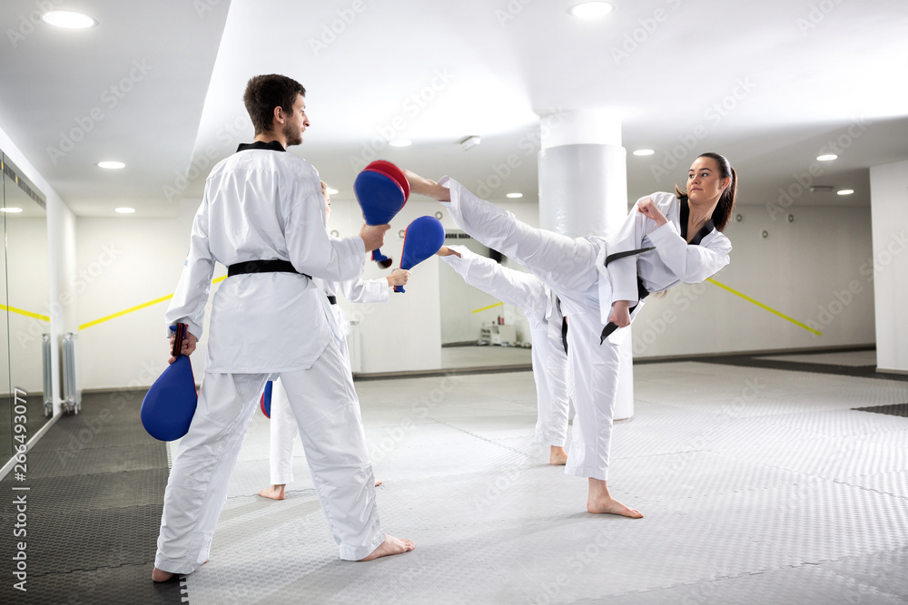 Foto Martial arts competitors and their trainers practicing high kicks in taekwondo