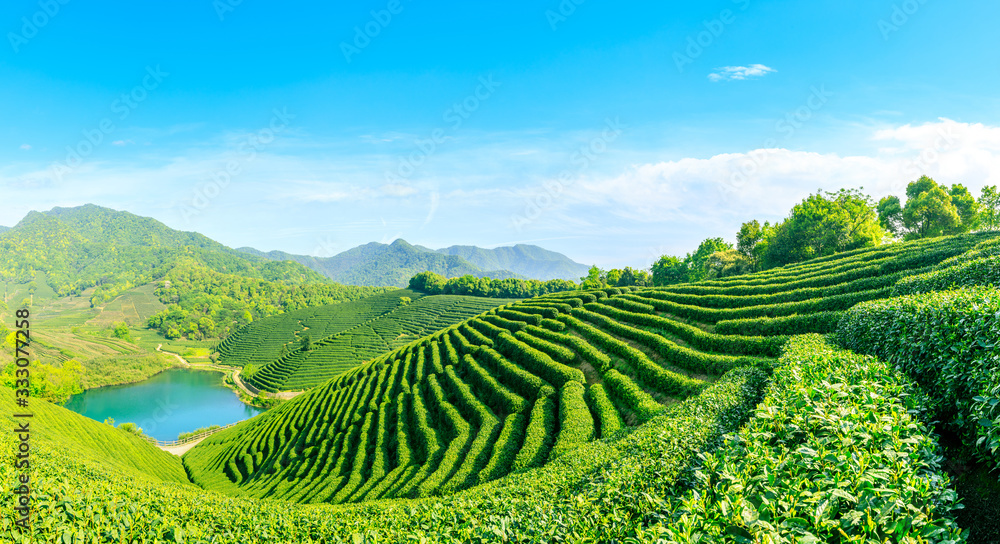 Foto Green tea mountain on a sunny day,tea plantation natural background