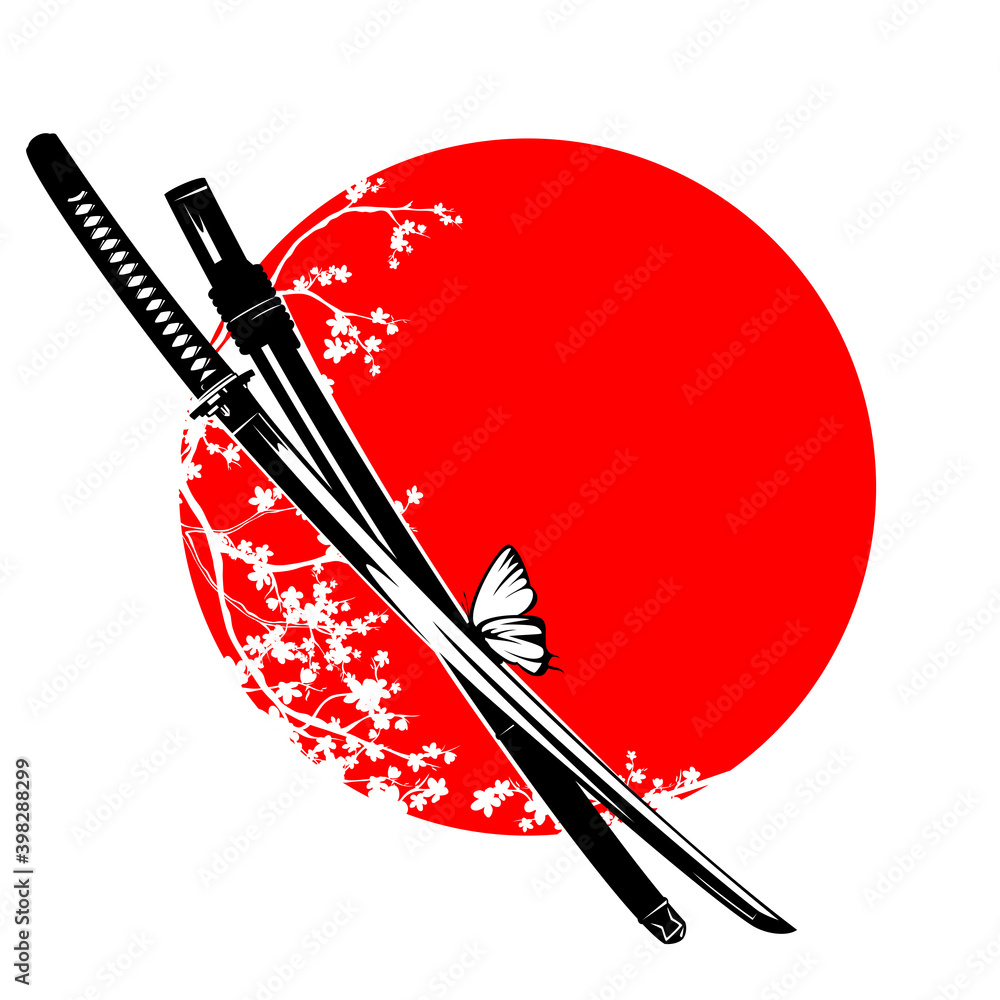 Foto japanese samurai katana sword with butterfly and sakura tree blossom against red