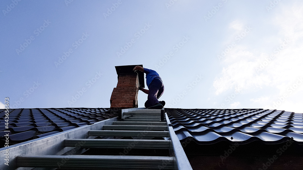 Foto a chimney sweep climbs a metal ladder to the roof of the bathhouse to clean the