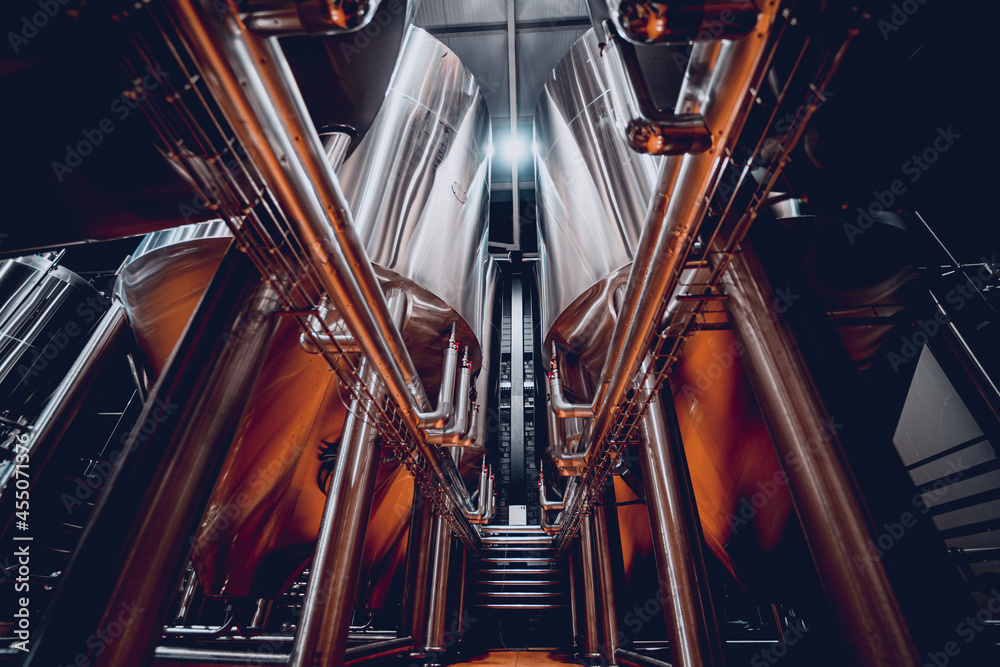 Foto Rows of steel tanks for beer fermentation and maturation in a craft brewery