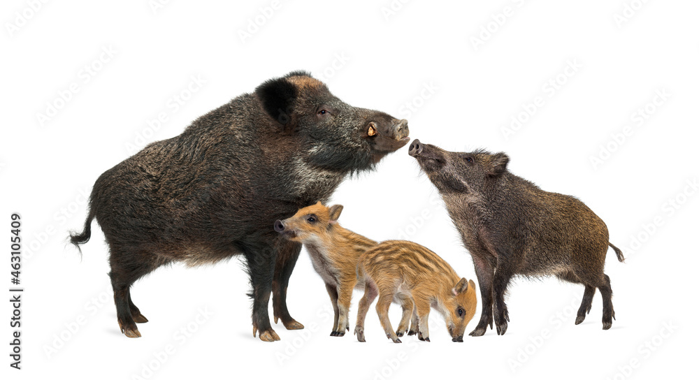 Foto Family wild boar mother and baby, standing in front, isolated on white