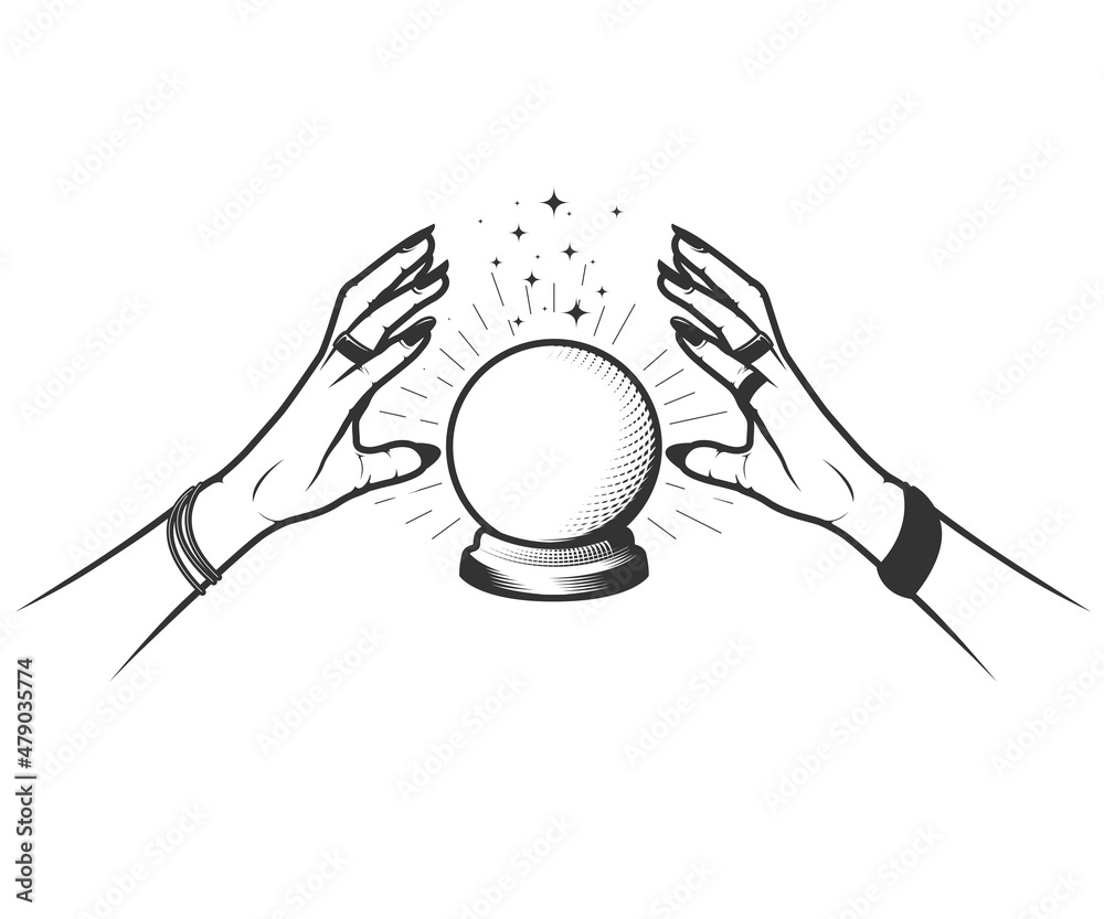 Foto Hands of soothsayer over fortune-teller glass ball, witch prediction magic spher