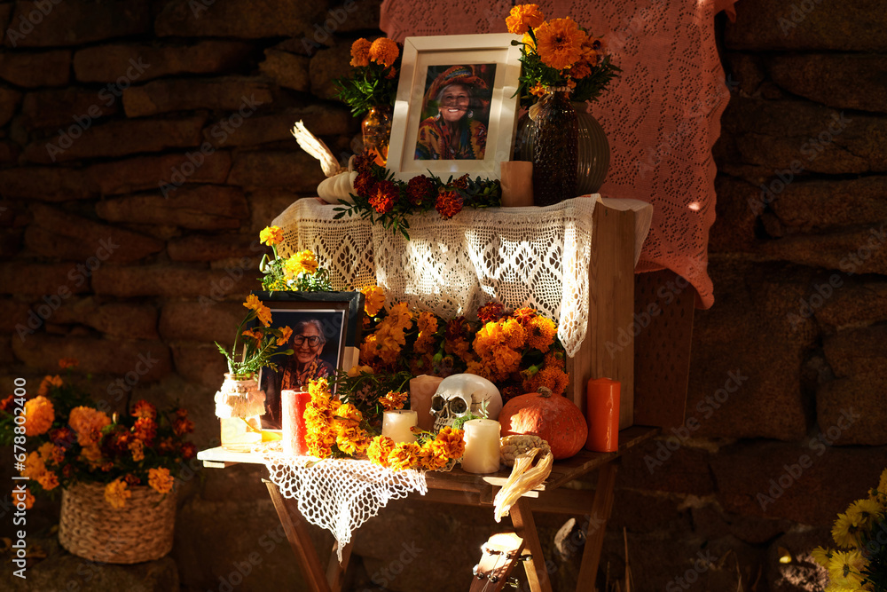 Foto Altar in honor of the day of all the dead decorating with flowers and candles