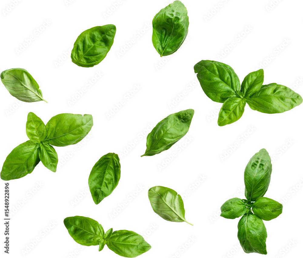 Quadro su tela A collection of fresh basil leaves scattered on a white background, ideal for culinary uses