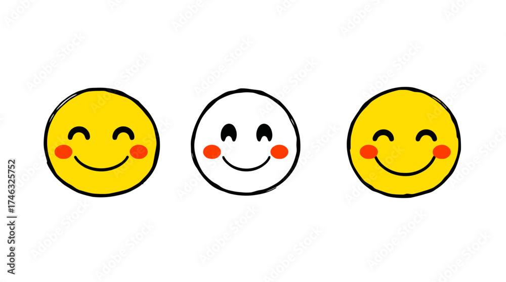 Quadro su tela Three cartoon smiley faces, two yellow and one white, all with rosy cheeks and happy expressions, lined up on a white background