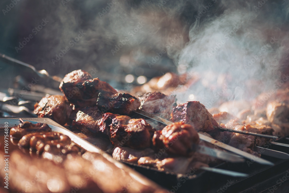 Quadro su tela Savory meats sizzling on the grill at a vibrant summer barbecue celebration in a