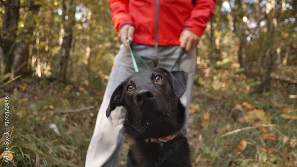 Quadro su tela A black dog on a leash looks up attentively, exploring a forest with its owner