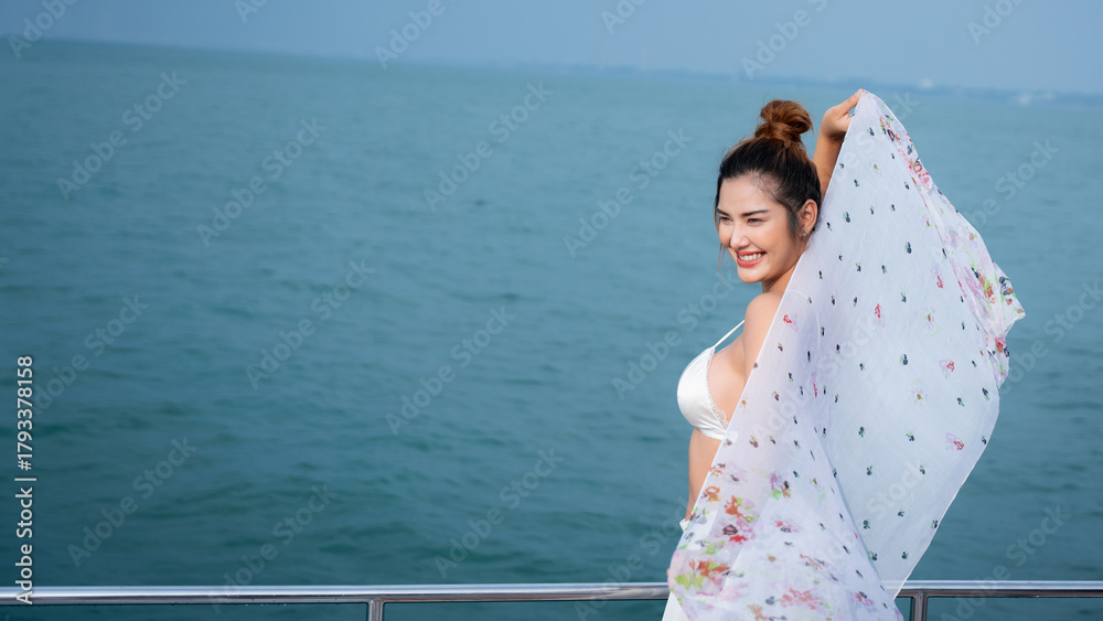 Quadro su tela Beautiful woman relaxing on yacht with blue sea background, wearing white bikini and floral shawl under sunlight