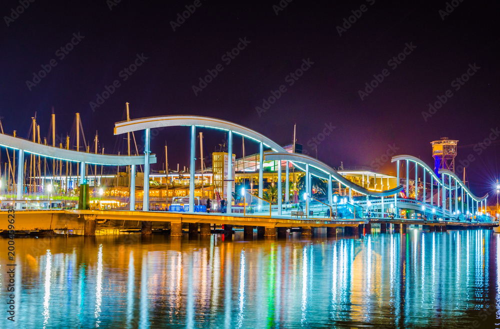 Quadro su tela Night view of Rambla de Mar promenade in Barcelona, Spain.