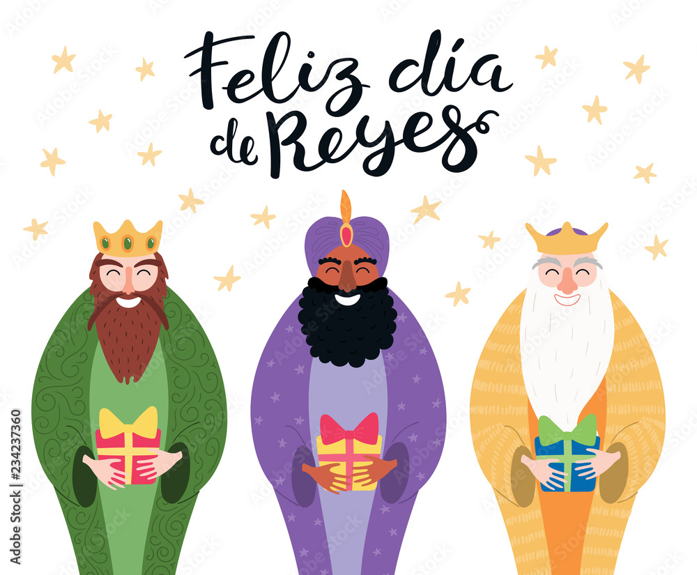 Quadro su tela Hand drawn vector illustration of three kings with gifts, Spanish quote Feliz Dia de Reyes, Happy Kings Day