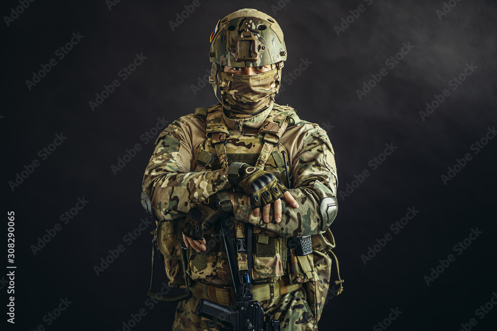 Quadro su tela portrait of serious confident brave soldier in army wear, camouflage, isolated over black background