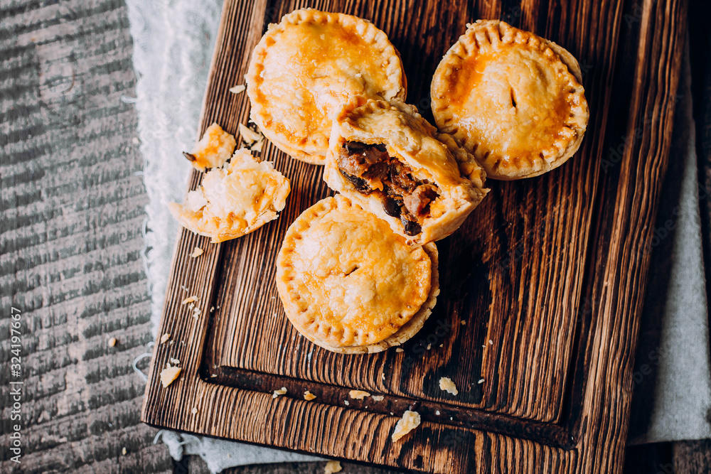 Quadro su tela Fresh Traditional Australian meat mini pie on the wooden board on table backgrou