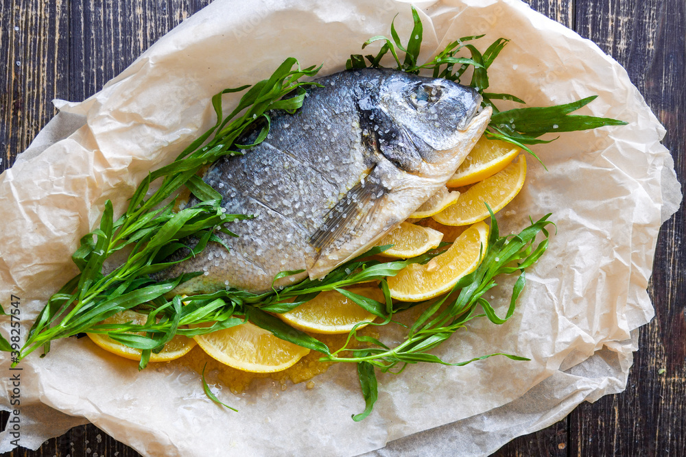 Quadro su tela Fresh sea bream with lemon and herbs tarragon and dill on paper for baking