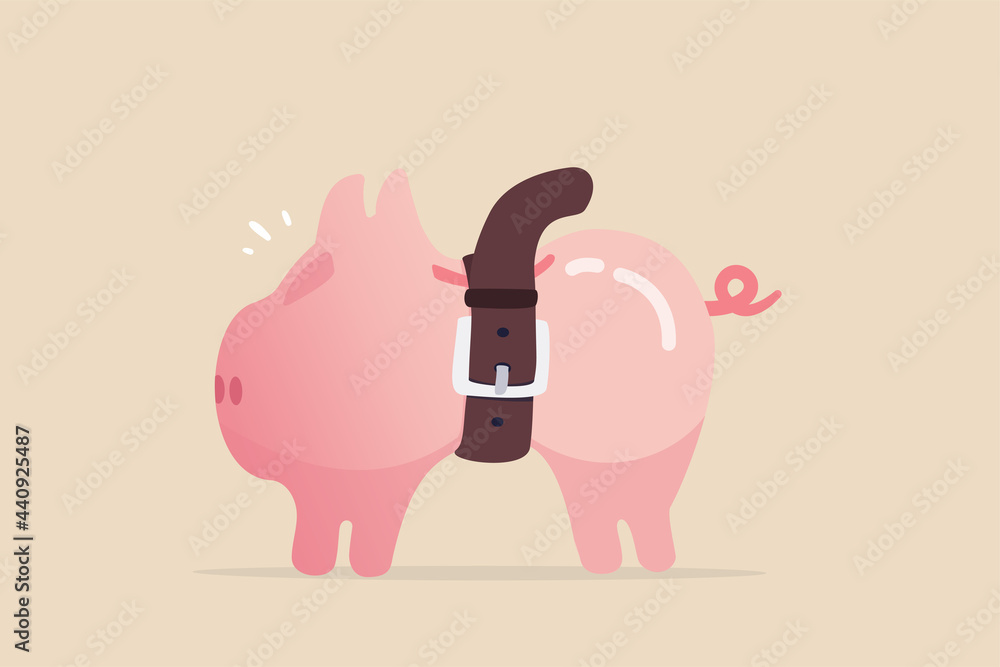 Quadro su tela Tighten belt to reduce budget or spending, financial crisis or economic slow down, keep cost and expense low to survive, pink piggybank tighten belt on his belly metaphor of saving cost