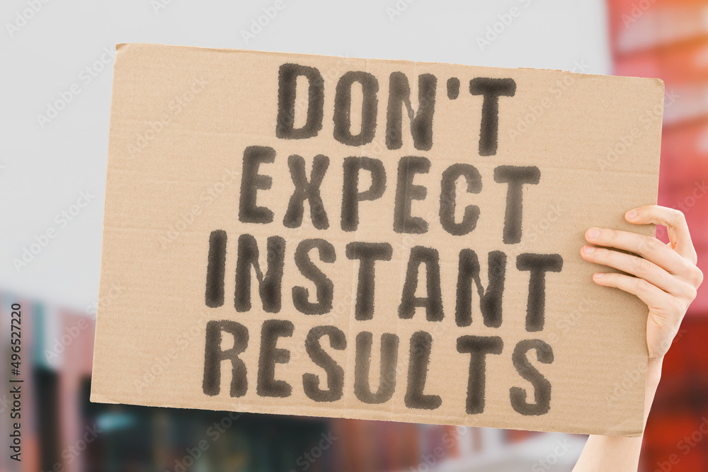 Quadro su tela The phrase Don’t expect instant results on a banner in men's hands with blurred background