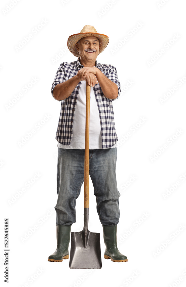Quadro su tela Full length portrait of a mature farmer leaning on a shovel and smiling