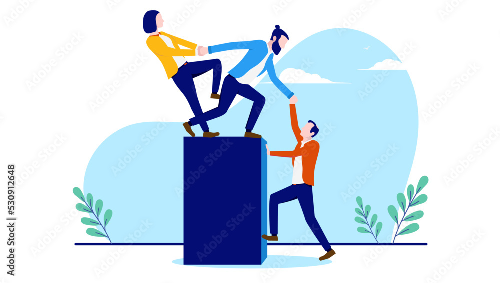 Quadro su tela Teamwork - Businesspeople in casual clothes help and support each other to get on top of pole
