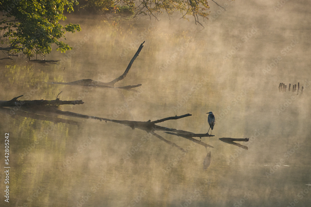 Quadro su tela Great Blue Heron on a foggy morning