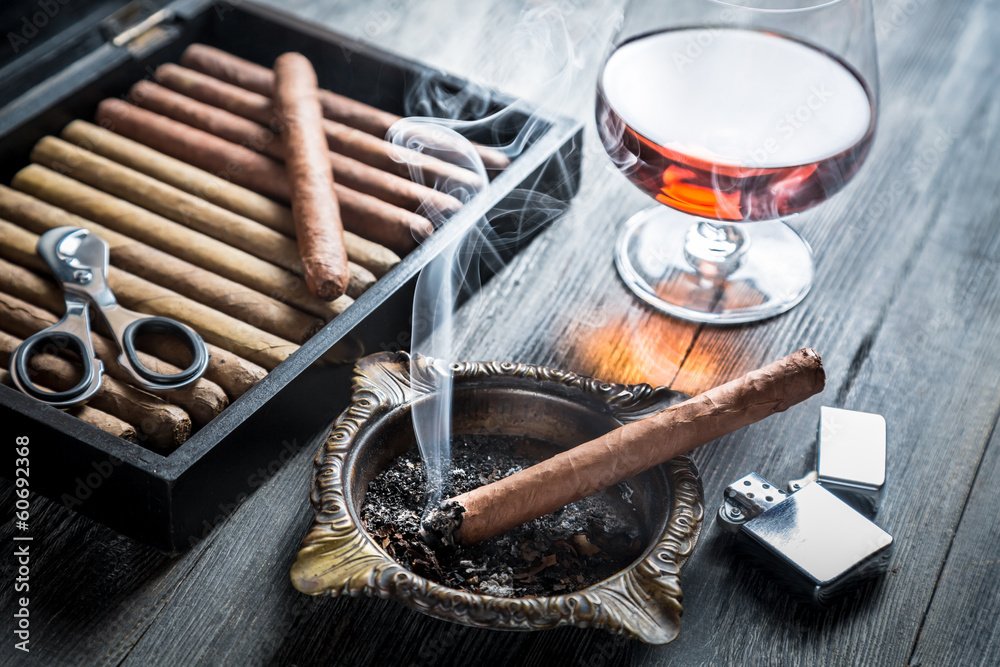Quadro su tela Taste of cognac and cigar fuming