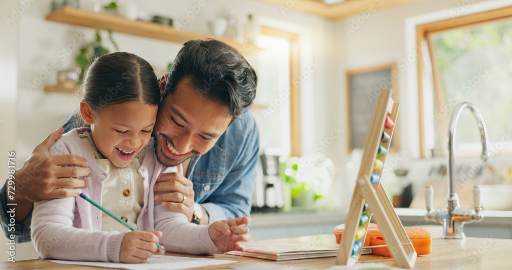 Quadro su tela Homework, father and girl with education, teaching and conversation with support, excited and knowledge