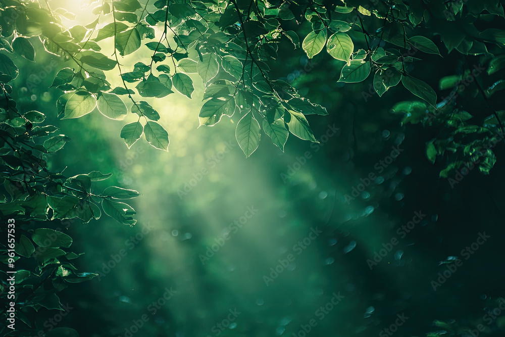 Foto Sunlight filtering through a dense forest canopy, casting a magical glow on the lush green leaves