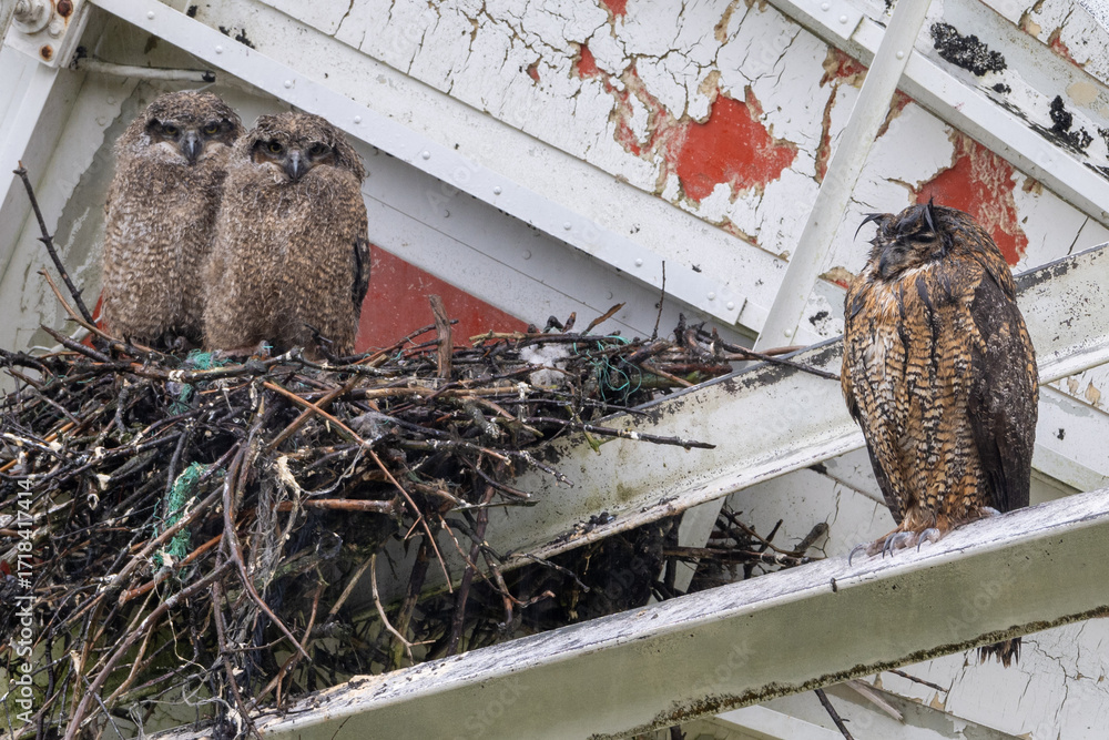 Foto Three wild great horned owlets perched in a nest of sticks on a metal platform