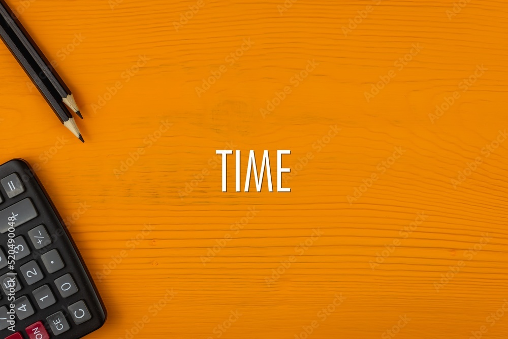 Foto TIME - word (text) on a yellow wooden background, a calculator and a pencil