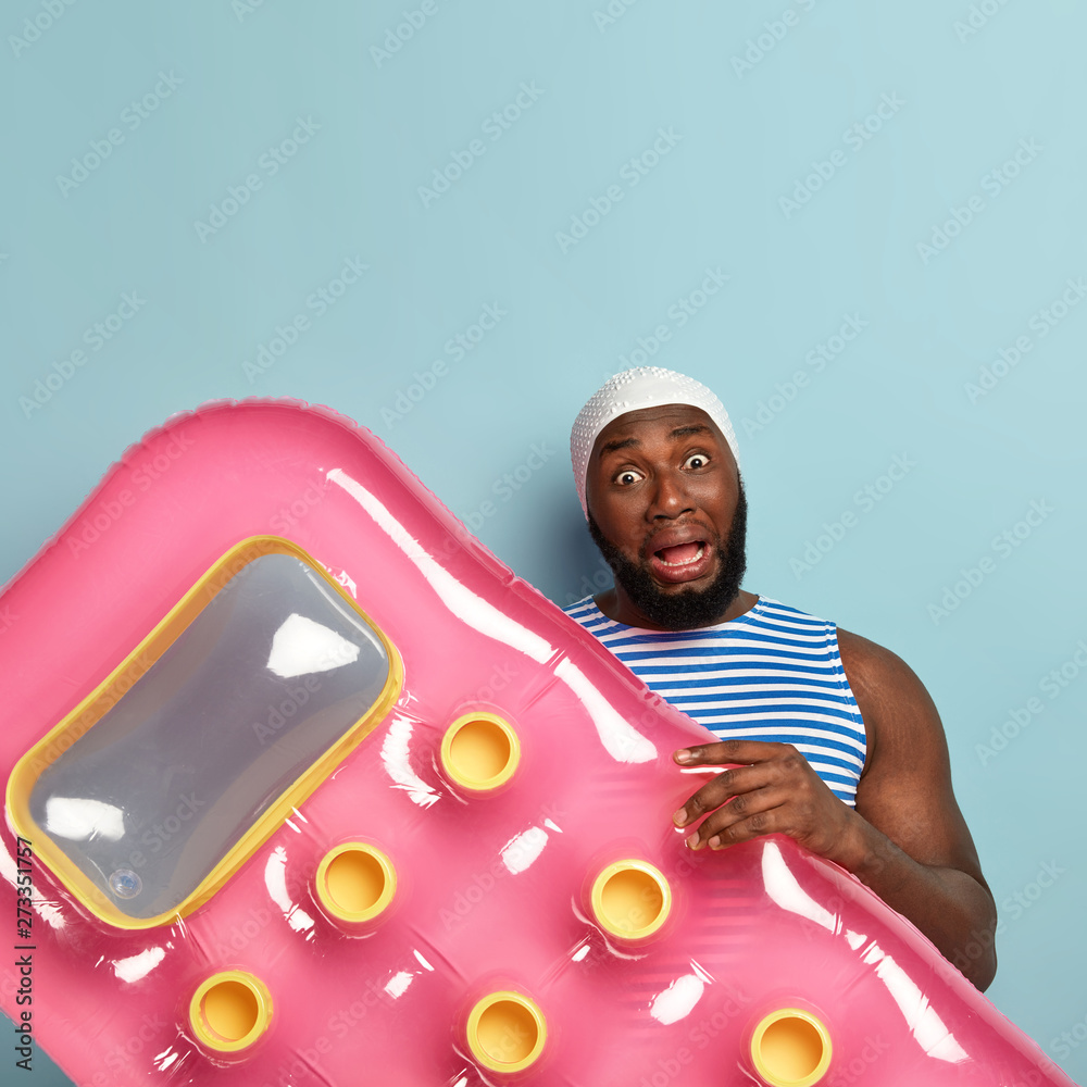 Foto Vertical shot of embarrassed worried shocked man stares at camera, holds inflata