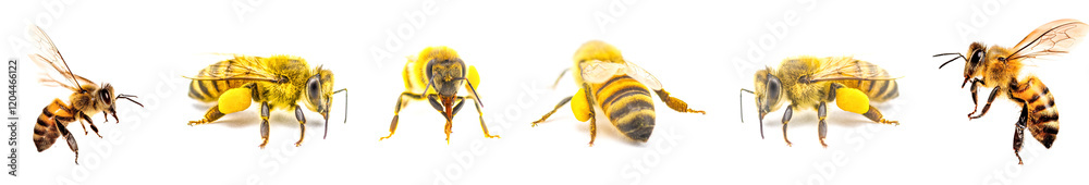 Foto western honey bee or European honey bee - Apis mellifera - closeup side view in flight flying in mid air and with pollen sac on tibia