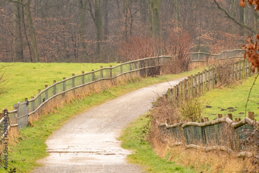 Foto Winding gravel path through green fields bordered by wooden fences in a serene c